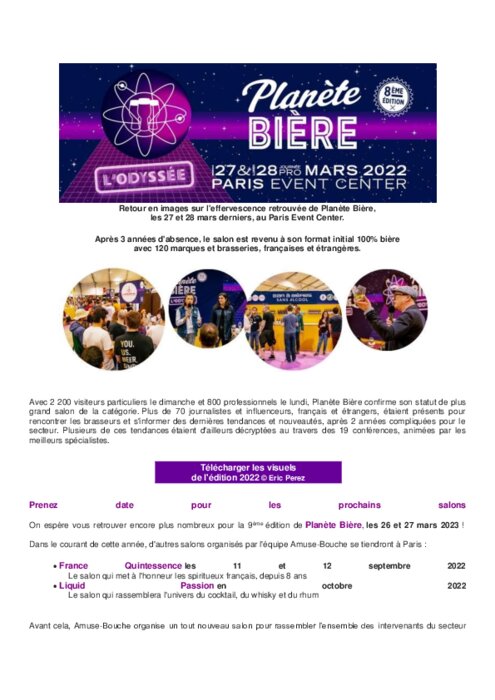 Métiers 06 avril 2022 - 15:21 Après 3 années d'absence, le salon est revenu à son format initial 100% bière avec 120 marques et brasseries, françaises et étrangères. PDF (170 Ko) Télécharger