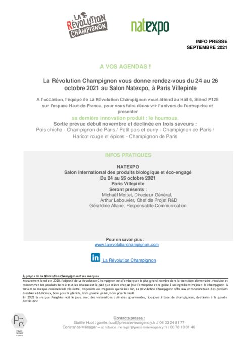 Métiers 28 septembre 2021 - 10:15 A l’occasion, l’équipe de La Révolution Champignon vous attend au Hall 6, Stand P128 sur l’espace Haut-de-France, pour vous faire découvrir l’univers de l’entreprise et présenter sa dernière innovation produit : le houmous. PDF (224 Ko) Télécharger
