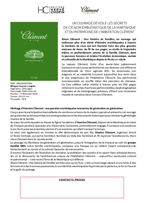 Une histoire de familles, un ouvrage qui embrasse plus d’un siècle d’histoire martiniquaise à travers la destinée de ceux qui ont façonné l’une des plus grandes maisons de rhum. Au fil de ces pages, se révèle la trajectoire intime et profondément ancrée de la famille Clément, dont le parcours traverse et éclaire l’évolution économique, sociale et culturelle de la Martinique depuis la fin du XIXe siècle.