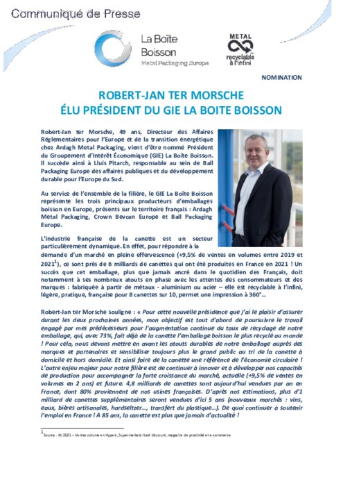 Métiers 16 mai 2022 - 13:34 Robert-Jan ter Morsche, 49 ans, Directeur des Affaires Réglementaires pour l’Europe et de la transition énergétique chez Ardagh Metal Packaging, vient d’être nommé Président du Groupement d’Intérêt Économique (GIE) La Boîte Boisson. PDF (288 Ko) Télécharger