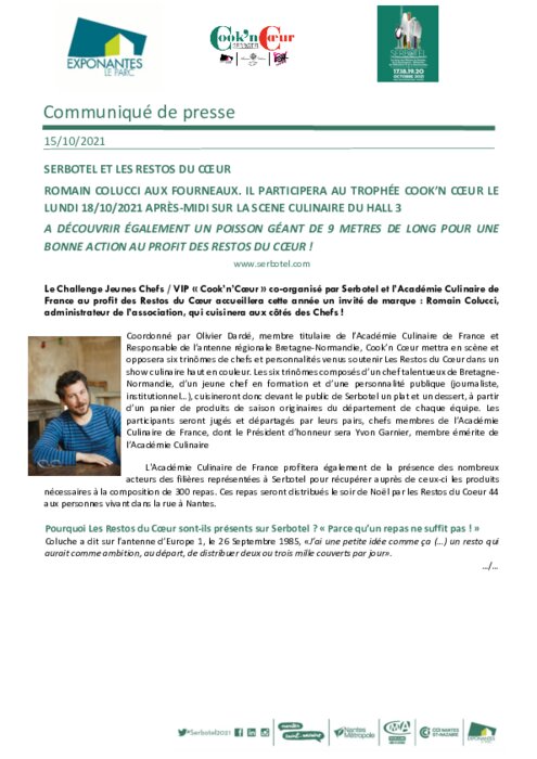 Le Challenge Jeunes Chefs / VIP « Cook’n’Cœur » co-organisé par Serbotel et l’Académie Culinaire de France au profit des Restos du Cœur accueillera cette année un invité de marque : Romain Colucci, administrateur de l’association, qui cuisinera aux côtés des Chefs