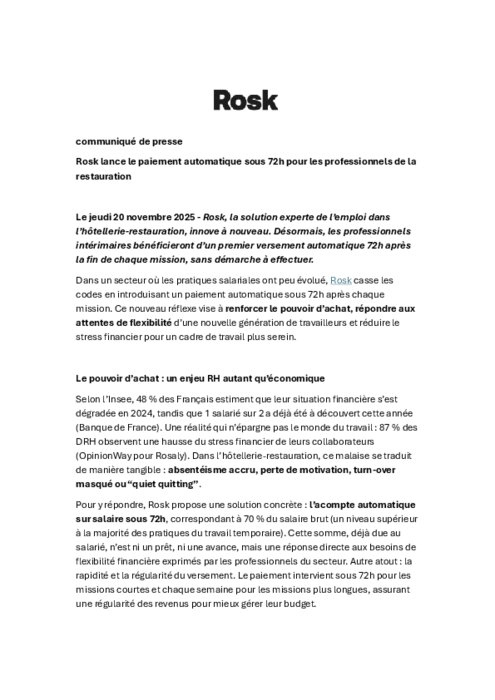 Rosk, la solution experte de l’emploi dans l’hôtellerie-restauration, innove à nouveau. Désormais, les professionnels intérimaires bénéficieront d’un premier versement automatique 72h après la fin de chaque mission, sans démarche à effectuer. Dans un secteur où les pratiques salariales ont peu évolué, Rosk casse les codes en introduisant un paiement automatique sous 72h après chaque mission. Ce nouveau réflexe vise à renforcer le pouvoir d’achat, répondre aux attentes de flexibilité d’une nouvelle génération de travailleurs et réduire le stress financier pour un cadre de travail plus serein.