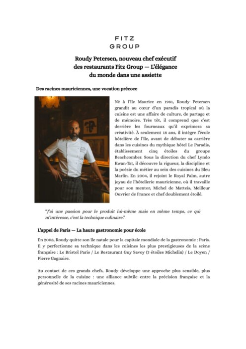 Roudy Petersen rejoint le groupe Fitz Group comme nouveau chef exécutif, marquant une étape majeure dans le développement culinaire de l’enseigne. Fort d’un parcours international — auprès de chefs comme Guy Savoy et Pierre Gagnaire puis à la tête de cuisines à Doha et à Abu Dhabi — il apporte une vision cosmopolite et raffinée.