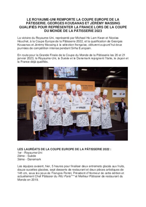 La victoire du Royaume-Uni, représenté par Michael Ho Lam Kwan et Nicolas Houchet, à la Coupe Europe de la Pâtisserie 2022, et la qualification de Georges Kousanas et Jérémy Massing à la sélection française, clôturent aujourd’hui deux journées de compétition intense pendant Sirha Europain.