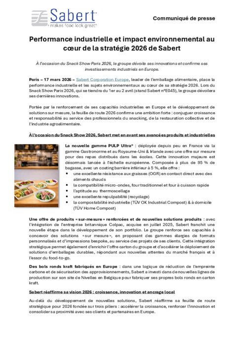 Sabert Corporation Europe, leader de l’emballage alimentaire, place la performance industrielle et les sujets environnementaux au cœur de sa stratégie 2026. Lors du Snack Show Paris 2026, qui se tiendra du 1er au 2 avril (stand Sabert n°E045), le groupe dévoilera ses dernières innovations. Portée par le renforcement de ses capacités industrielles en Europe et le développement de solutions sur mesure, la feuille de route 2026 confirme une ambition forte : conjuguer croissance et responsabilité au service des professionnels du snacking, de la restauration collective et de l’industrie agroalimentaire.