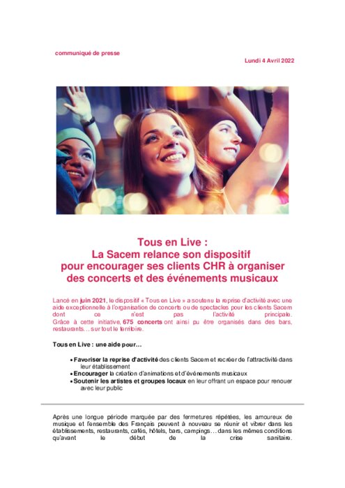 Après une longue période marquée par des fermetures répétées, les amoureux de musique et l’ensemble des Français peuvent à nouveau se réunir et vibrer dans les établissements, restaurants, cafés, hôtels, bars, campings… dans les mêmes conditions qu’avant le début de la crise sanitaire. Pour accompagner au mieux ses clients CHR dans cette nouvelle phase, la Sacem reconduit jusqu’au 30 novembre 2022 son dispositif "Tous en live".