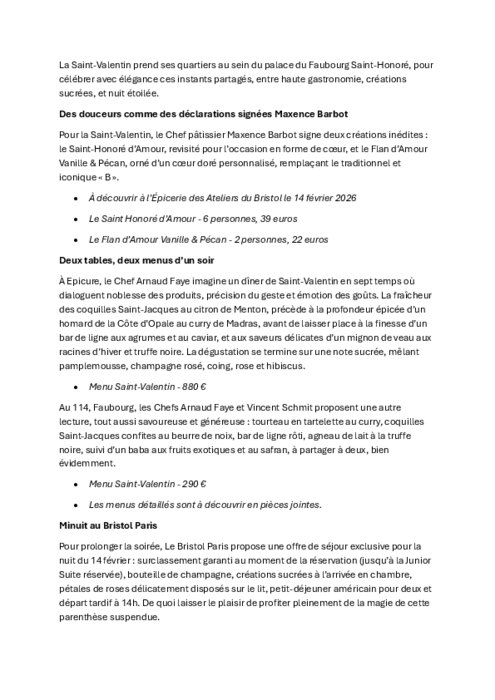 La Saint-Valentin prend ses quartiers au sein du palace du Faubourg Saint‑Honoré, pour célébrer avec élégance ces instants partagés, entre haute gastronomie, créations sucrées, et nuit étoilée.