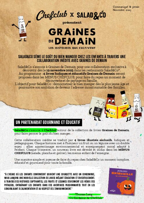 Cette collaboration inédite se traduit par 4 livres illustrés exclusifs, ludiques et pédagogiques. Chaque histoire met à l'honneur un fruit ou un légume avec un double enjeu : allier apprentissage environnemental et enseignement moral adapté à l'enfant. Chaque trimestre, un nouveau livre est dévoilé et inclus dans les MENUS CHEFCLUB (salade, plancha et goûter), les menus enfant de l’enseigne.