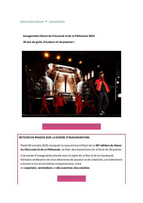 Métiers 30 octobre 2025 - 05:22 Mardi 28 octobre marquait le coup d’envoi officiel de la 30ᵉ édition du Salon du Chocolat et de la Pâtisserie, au Parc des Expositions de la Porte de Versailles. PDF (393 Ko) Télécharger @Brunet-Monié Photographie