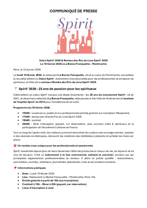 Le lundi 16 février, le restaurant La Bonne Franquette, situé au coeur de Montmartre, accueillera la nouvelle édition du Salon Spirit’, événement incontournable pour les professionnels et amateurs de spiritueux, et hôte de la remise officielle des Prix du Livre Spirit’ 2025.