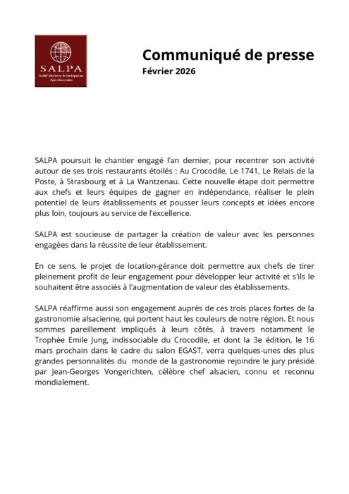 Salpa poursuit le chantier engagé l’an dernier, pour recentrer son activité autour de ses trois restaurants étoilés : Au Crocodile, Le 1741, Le Relais de la Poste, à Strasbourg et à La Wantzenau. Cette nouvelle étape doit permettre aux chefs et leurs équipes de gagner en indépendance, réaliser le plein potentiel de leurs établissements et pousser leurs concepts et idées encore plus loin, toujours au service de l’excellence.