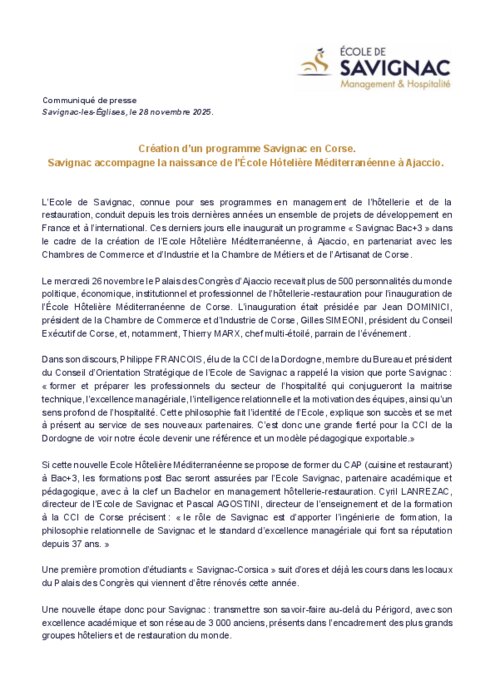 L’Ecole de Savignac, connue pour ses programmes en management de l’hôtellerie et de la restauration, conduit depuis les trois dernières années un ensemble de projets de développement en France et à l’international. Ces derniers jours elle inaugurait un programme « Savignac Bac+3 » dans le cadre de la création de l’Ecole Hôtelière Méditerranéenne, à Ajaccio, en partenariat avec les Chambres de Commerce et d’Industrie et la Chambre de Métiers et de l’Artisanat de Corse.