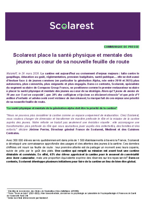 La cantine est aujourd’hui au croisement d’enjeux majeurs : lutte contre le gaspillage, éducation au goût, réglementation, pression budgétaire, santé publique… elle se doit aussi d’évoluer face à de jeunes convives (en particulier la génération Alpha, née entre 2010 et 2025) plus autonomes, plus connectés, plus exigeants et plus engagés. Dans ce contexte, Scolarest, spécialiste du segment scolaire de Compass Group France, se positionne comme le premier restaurateur scolaire à placer la santé physique et mentale des jeunes au cœur de sa stratégie. Alors qu’1 jeune de moins de 18 ans sur 5 est en surpoids1, que 30% des collégiens et lycéens se déclarent stressés et que près d’1 million d’enfants et adolescents sont victimes de harcèlement, la marque fait de ces enjeux une priorité de sa nouvelle feuille de route.