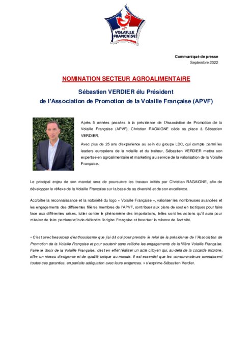 Métiers 19 septembre 2022 - 16:43 Après 5 années passées à la présidence de l'Association de Promotion de la Volaille Française (APVF), Christian RAGAIGNE cède sa place à Sébastien VERDIER. PDF (310 Ko) Télécharger