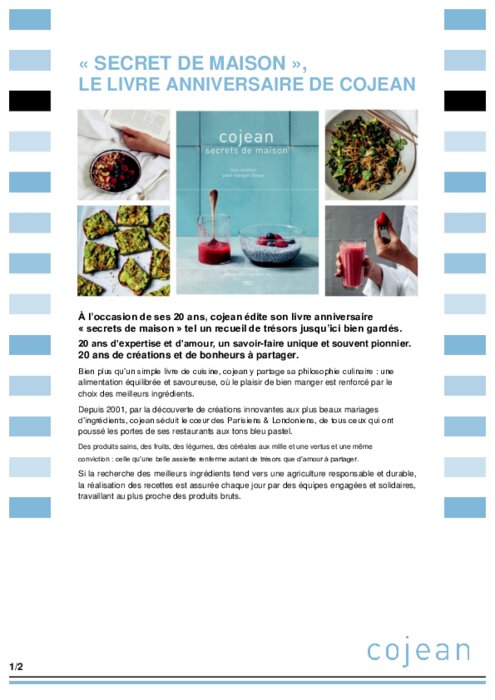 Métiers 05 octobre 2021 - 10:51 Bien plus qu’un simple livre de cuisine, cojean y partage sa philosophie culinaire : une alimentation équilibrée et savoureuse, où le plaisir de bien manger est renforcé par le choix des meilleurs ingrédients. PDF (3 Mo) Télécharger