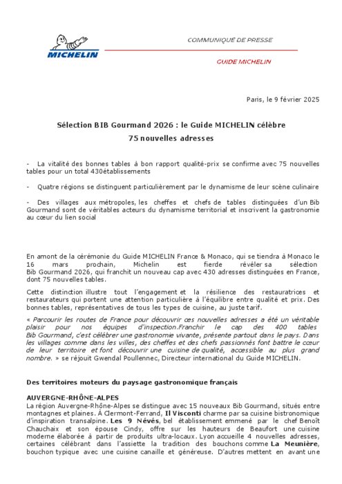 En amont de la cérémonie du Guide Michelin France & Monaco, qui se tiendra à Monaco le 16 mars prochain, Michelin est fier de révéler sa sélection Bib Gourmand 2026, qui franchit un nouveau cap avec 430 adresses distinguées en France, dont 75 nouvelles tables. Cette distinction illustre tout l’engagement et la résilience des restauratrices et restaurateurs qui portent une attention particulière à l’équilibre entre qualité et prix. Des bonnes tables, représentatives de tous les types de cuisine, au juste tarif.
