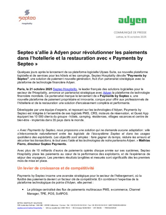 Quelques jours après le lancement de sa plateforme logicielle Ulyses Suite, sa nouvelle plateforme logicielle et de services pour les hôtels et les campings, Septeo Hospitality dévoile "Payments by Septeo", une solution de paiement nouvelle génération, fruit d'un partenariat stratégique avec la plateforme de technologie financière Adyen.