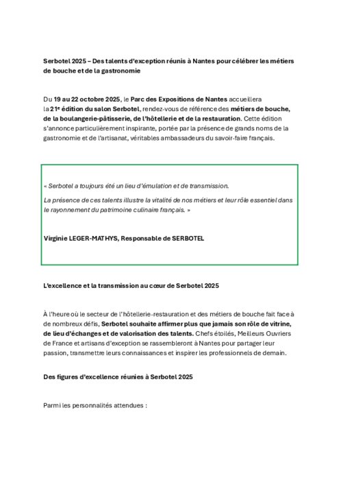 Du 19 au 22 octobre, le Parc des Expositions de Nantes accueillera la 21ᵉ édition du salon Serbotel, rendez-vous de référence des métiers de bouche, de la boulangerie-pâtisserie, de l’hôtellerie et de la restauration. Cette édition s’annonce particulièrement inspirante, portée par la présence de grands noms de la gastronomie et de l’artisanat, véritables ambassadeurs du savoir-faire français.