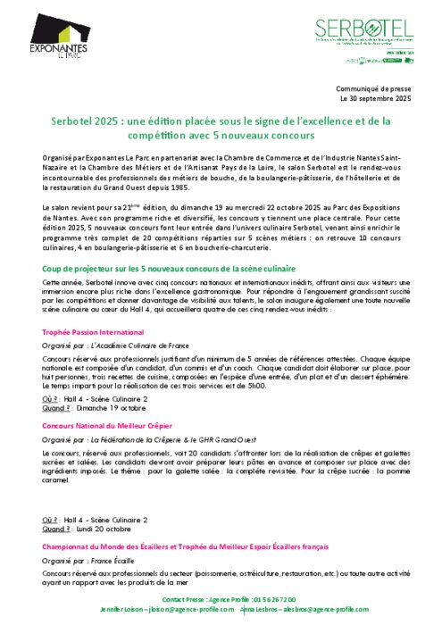 Organisé par Exponantes Le Parc en partenariat avec la Chambre de Commerce et de l’Industrie Nantes Saint-Nazaire et la Chambre des Métiers et de l’Artisanat Pays de la Loire, le salon Serbotel est le rendez-vous incontournable des professionnels des métiers de bouche, de la boulangerie-pâtisserie, de l’hôtellerie et de la restauration du Grand Ouest depuis 1985.
