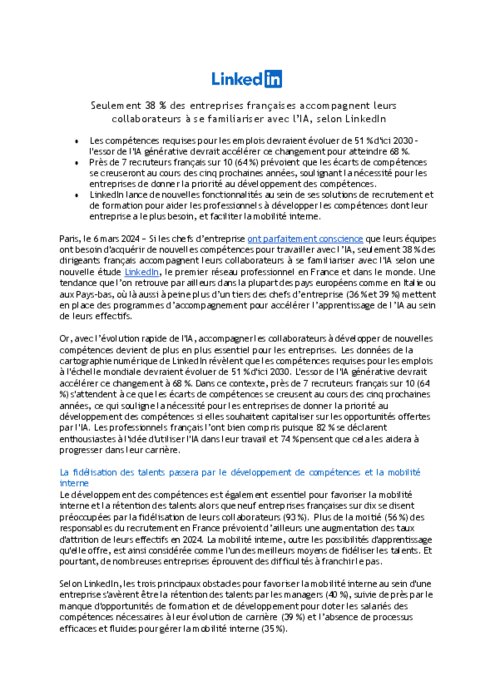 Si les chefs d’entreprise ont parfaitement conscience que leurs équipes ont besoin d'acquérir de nouvelles compétences pour travailler avec l’IA, seulement 38 % des dirigeants français accompagnent leurs collaborateurs à se familiariser avec l'IA selon une nouvelle étude LinkedIn, le premier réseau professionnel en France et dans le monde. Une tendance que l’on retrouve par ailleurs dans la plupart des pays européens comme en Italie ou aux Pays-bas, où là aussi à peine plus d’un tiers des chefs d’entreprise (36 % et 39 %) mettent en place des programmes d’accompagnement pour accélérer l’apprentissage de l’IA au sein de leurs effectifs.
