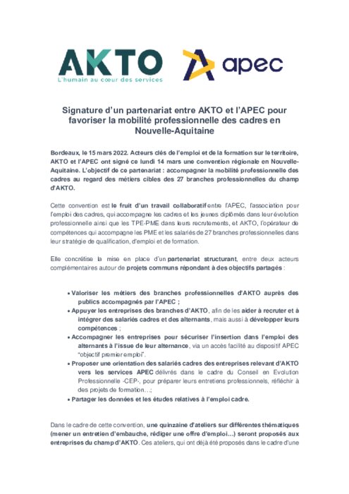 Signature d’un partenariat entre AKTO et l’APEC pour favoriser la mobilité professionnelle des cadres en Nouvelle-Aquitaine