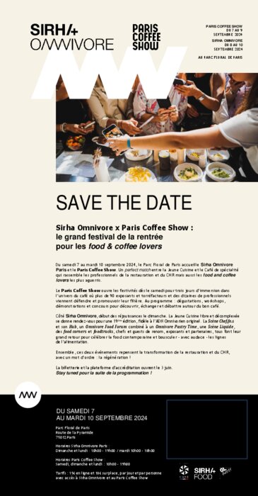 Du samedi 7 au mardi 10 septembre , le Parc Floral de Paris accueille Sirha Omnivore Paris et le Paris Coffee Show. Un perfect match entre la Jeune Cuisine et le Café de spécialité qui rassemble les professionnels de la restauration et du CHR mais aussi les food and coffee lovers les plus aguerris.