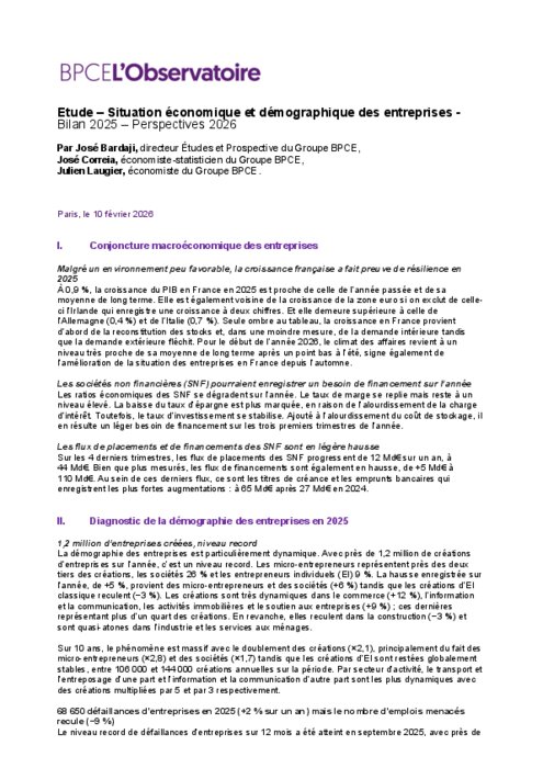 2025 aura été une année de contrastes pour les entreprises françaises. Malgré un environnement économique tendu, la croissance est restée résiliente et les créations d’entreprises ont atteint un niveau record. Dans le même temps, les défaillances se sont stabilisées, avec des dynamiques très différenciées selon la taille, le secteur et le territoire. À travers cette nouvelle étude, BPCE L’Observatoire analyse les grands équilibres de 2025 et esquisse les perspectives économiques pour 2026.
