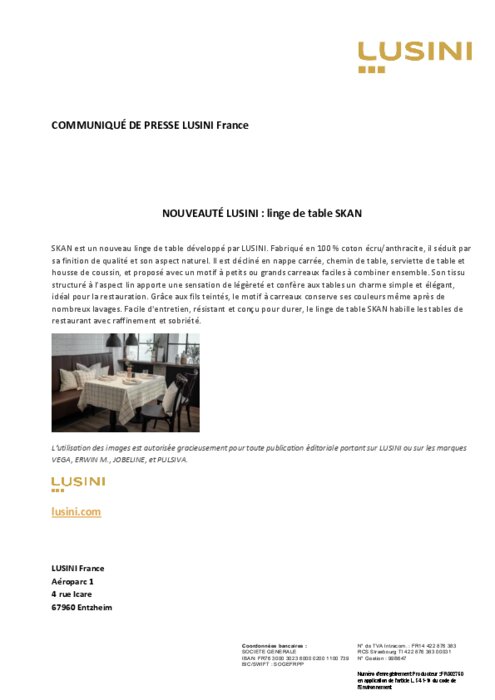 Skan est un nouveau linge de table développé par Lusini. Fabriqué en 100 % coton écru/anthracite, il séduit par sa finition de qualité et son aspect naturel. Il est décliné en nappe carrée, chemin de table, serviette de table et housse de coussin, et proposé avec un motif à petits ou grands carreaux faciles à combiner ensemble. Son tissu structuré à l’aspect lin apporte une sensation de légèreté et confère aux tables un charme simple et élégant, idéal pour la restauration. Grâce aux fils teintés, le motif à carreaux conserve ses couleurs même après de nombreux lavages. Facile d'entretien, résistant et conçu pour durer, le linge de table Skan habille les tables de restaurant avec raffinement et sobriété.