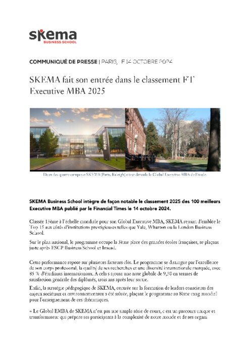 Skema Business School intègre de façon notable le classement 2025 des 100 meilleurs Executive MBA publié par le Financial Times le 14 octobre. Classée 13e à l’échelle mondiale pour son Global Executive MBA, SKEMA rejoint d'emblée le Top 15 aux côtés d’institutions prestigieuses telles que Yale, Wharton ou la London Business School.