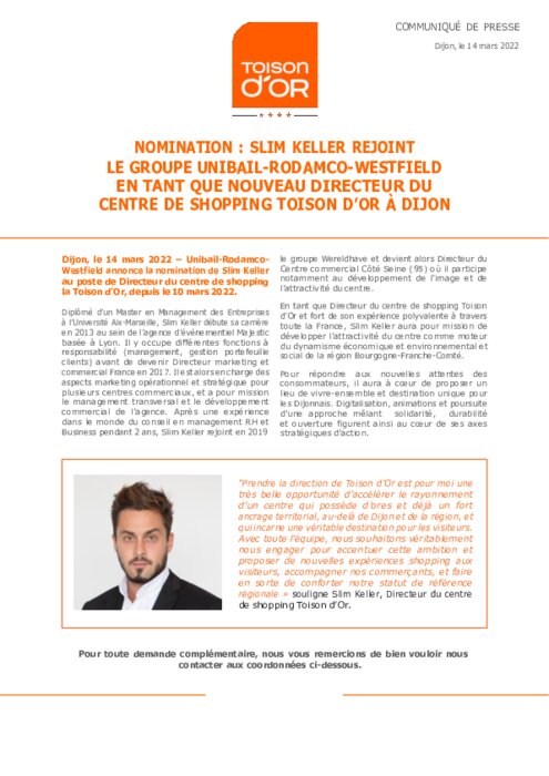 En tant que Directeur du centre de shopping Toison d’Or et fort de son expérience polyvalente à travers toute la France, Slim Keller aura pour mission de développer l’attractivité du centre comme moteur du dynamisme économique et environnemental et social de la région Bourgogne-Franche-Comté.