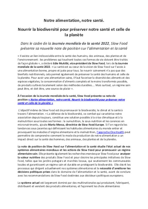 Métiers 05 avril 2022 - 19:05 À l’occasion de la Journée mondiale de la santé, Slow Food présente sa note de position « Notre alimentation, notre santé. Nourrir la biodiversité pour préserver notre santé et celle de la planète ». PDF (180 Ko) Télécharger PDF (8 Mo) Télécharger