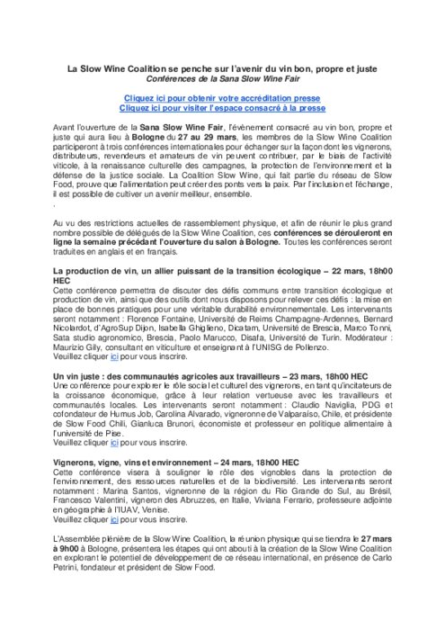 Avant l’ouverture de la Sana Slow Wine Fair, l’évènement consacré au vin bon, propre et juste qui aura lieu à Bologne du 27 au 29 mars, les membres de la Slow Wine Coalition participeront à trois conférences internationales pour échanger sur la façon dont les vignerons, distributeurs, revendeurs et amateurs de vin peuvent contribuer, par le biais de l’activité viticole, à la renaissance culturelle des campagnes, la protection de l’environnement et la défense de la justice sociale.