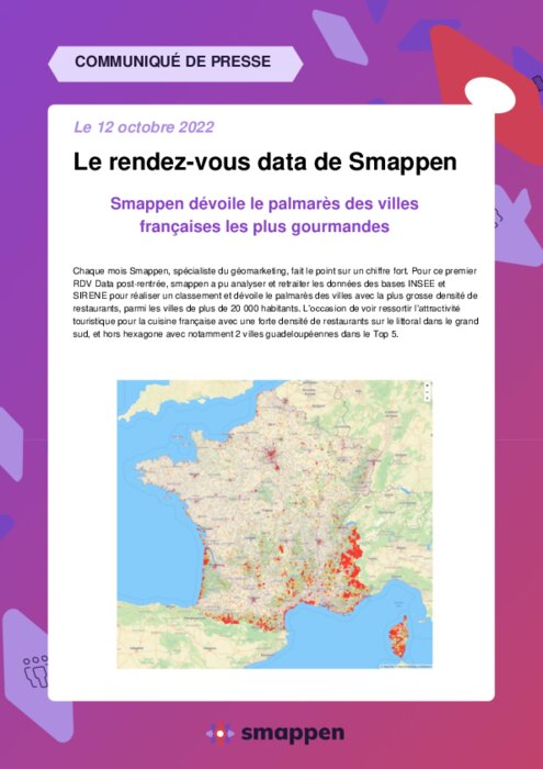 Alors que le secteur de la restauration connaît à la fois un contexte social, sanitaire et économique qui impacte durablement son activité et une accélération de la concurrence en Franchise, la question de l’implantation devient de plus en plus cruciale. Smappen a ainsi travaillé, par le biais de ce palmarès, sur les stratégies d'implantation à privilégier selon les territoires et les dynamiques de mobilité.