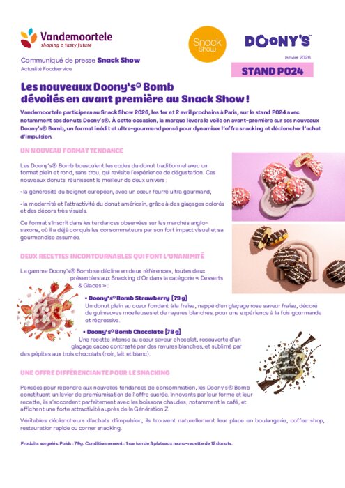 Vandemoortele participera au Snack Show 2026, les 1er et 2 avril à Paris, sur le stand P024 avec notamment ses donuts Doony's. À cette occasion, la marque lèvera le voile en avant-première sur ses nouveaux Doony’s Bomb, un format inédit et ultra-gourmand pensé pour dynamiser l’offre snacking et déclencher l’achat d’impulsion.