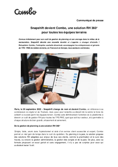Fournisseurs 20 septembre 2022 - 14:06 La startup Snapshift, désormais rebaptisée Combo, souhaite accompagner les entrepreneurs et gérants de TPE / PME de métiers terrains, en France et en Europe, tous secteurs confondus. PDF (223 Ko) Télécharger