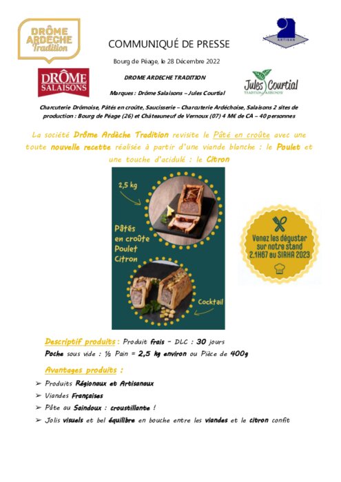 Fournisseurs 30 décembre 2022 - 12:04 Une toute nouvelle recette réalisée à partir d’une viande blanche : le Poulet et une touche d’acidulé : le Citron. PDF (199 Ko) Télécharger