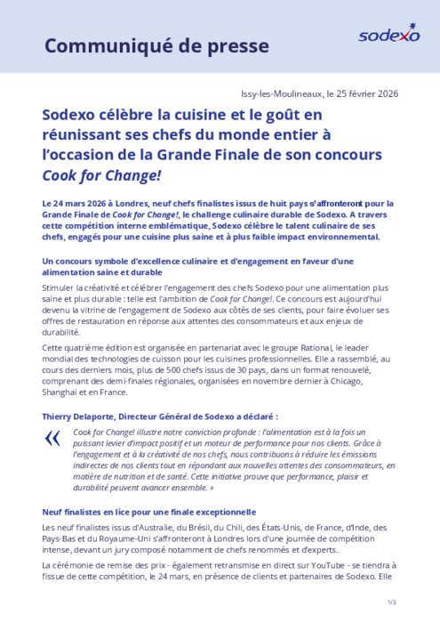 Le 24 mars à Londres, neuf chefs finalistes issus de huit pays s’affronteront pour la Grande Finale de Cook for Change!, le challenge culinaire durable de Sodexo. A travers cette compétition interne emblématique, Sodexo célèbre le talent culinaire de ses chefs, engagés pour une cuisine plus saine et à plus faible impact environnemental.