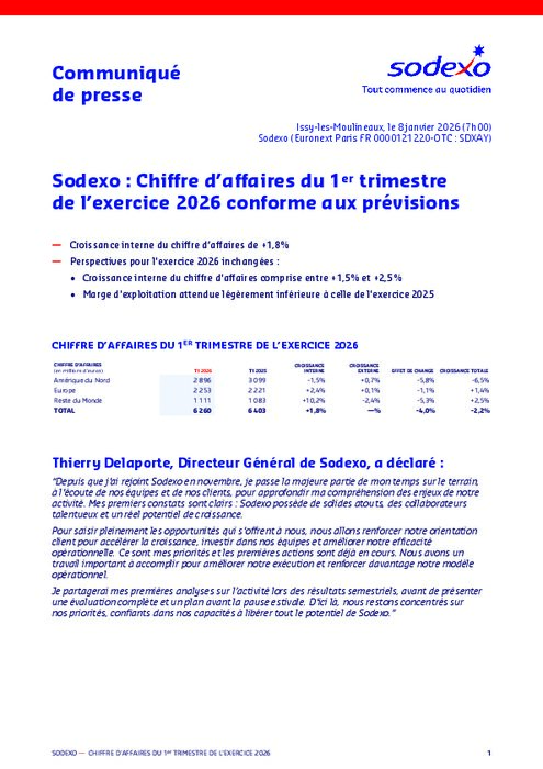 Chiffre d’affaires – Le chiffre d’affaires consolidé du 1er trimestre de l’exercice 2026 s'élève à 6,3 milliards d’euros, reflétant une croissance interne du chiffre d'affaires de +1,8%, un effet de change négatif de -4,0%, principalement dû à la dépréciation du dollar américain par rapport à l'euro, et un effet négligeable des acquisitions et cessions.