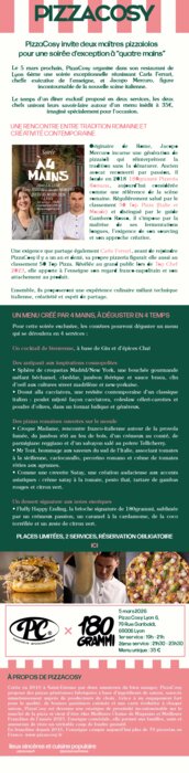 Snacking 26 février 2026 - 09:26 Le 5 mars, PizzaCosy (Lyon 6e) réunit la cheffe franco-napolitaine Carla Ferrari et le pizzaiolo romain Jacopo Mercuro pour une soirée d'exception mêlant tradition italienne et créativité contemporaine. PDF (462 Ko) Télécharger