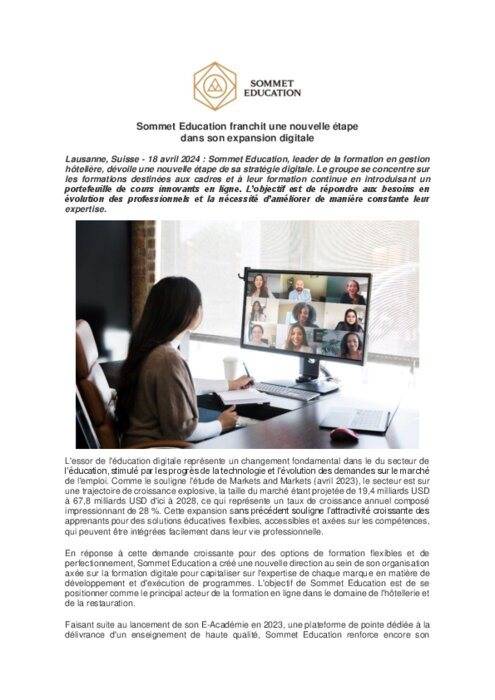 Sommet Education, leader de la formation en gestion hôtelière, dévoile une nouvelle étape de sa stratégie digitale. Le groupe se concentre sur les formations destinées aux cadres et à leur formation continue en introduisant un portefeuille de cours innovants en ligne. L’objectif est de répondre aux besoins en évolution des professionnels et la nécessité d’améliorer de manière constante leur expertise.