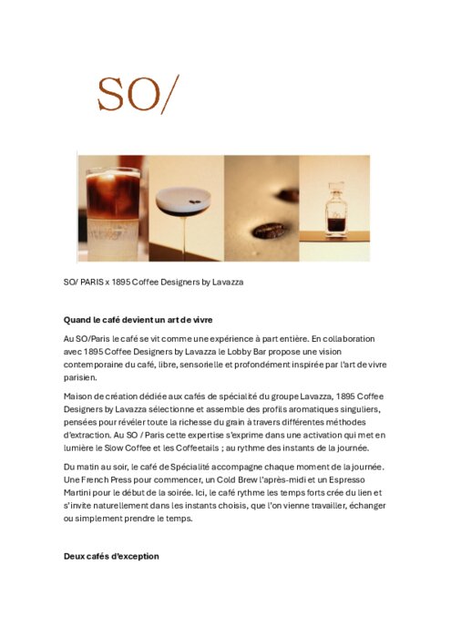 Au SO/Paris le café se vit comme une expérience à part entière. En collaboration avec 1895 Coffee Designers by Lavazza le Lobby Bar propose une vision contemporaine du café, libre, sensorielle et profondément inspirée par l’art de vivre parisien. Maison de création dédiée aux cafés de spécialité du groupe Lavazza, 1895 Coffee Designers by Lavazza sélectionne et assemble des profils aromatiques singuliers, pensées pour révéler toute la richesse du grain à travers différentes méthodes d’extraction. Au SO / Paris cette expertise s’exprime dans une activation qui met en lumière le Slow Coffee et les Coffeetails ; au rythme des instants de la journée.