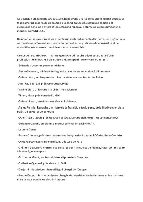 À l’occasion du Salon international de l'agriculture, il a été profité de ce grand rendez-vous pour faire signer un manifeste de soutien à la candidature des pratiques sociales et culturelles dans les bistrots et les cafés en France au patrimoine culturel immatériel mondial de l’Unesco. De nombreuses personnalités et professionnels ont accepté d’y apposer leur signature, affirmant ainsi leur attachement à ces pratiques de convivialité et de sociabilité, considérées comme un ciment essentiel du vivre-ensemble.