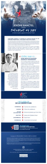 Pour cette 7e édition, Jérôme Banctel, chef triplement étoilé, succède à Alexandre Mazzia et prend la présidence du Jury France. À ce titre, il présidera le jury et participera au choix du candidat lors de la finale régionale française, qui se tiendra le lundi 23 novembre 2026 à Paris. À l’issue de cette étape clé, Jérôme Banctel accompagnera le lauréat jusqu’à la deuxième étape du concours, la grande finale internationale en 2027, à Milan.