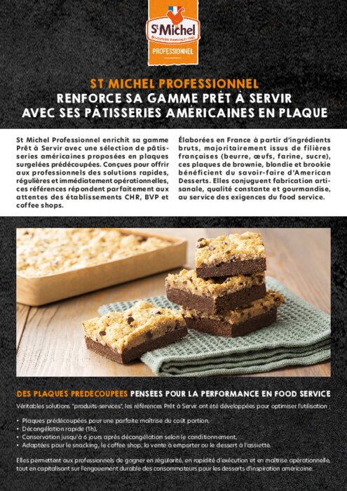 St Michel Professionnel enrichit sa gamme Prêt à Servir avec une sélection de pâtisseries américaines proposées en plaques surgelées prédécoupées. Conçues pour offrir aux professionnels des solutions rapides, régulières et immédiatement opérationnelles, ces références répondent parfaitement aux attentes des établissements CHR, BVP et coffee-shops.