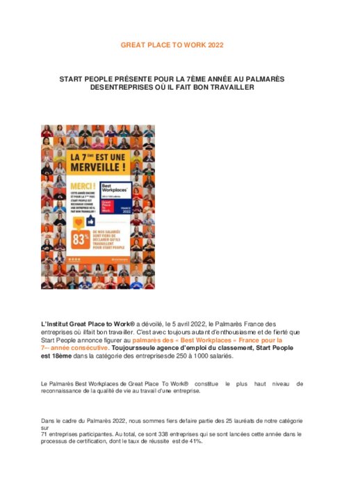 C’est avec toujours autant d’enthousiasme et de fierté que Start People annonce figurer au palmarès des « Best Workplaces » France pour la 7ème année consécutive.