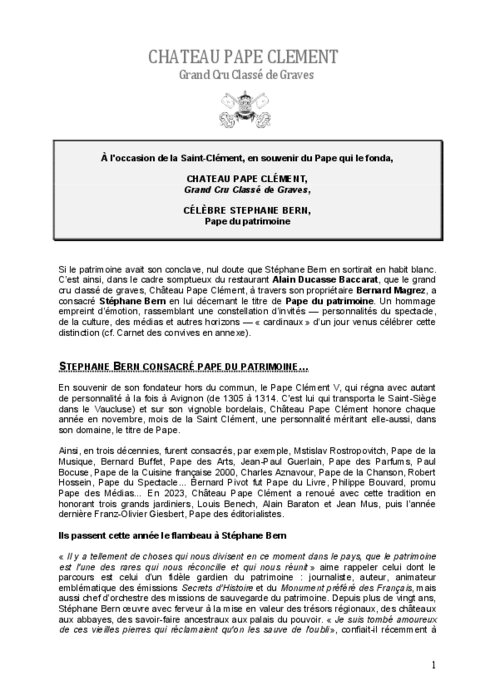 Si le patrimoine avait son conclave, nul doute que Stéphane Bern en sortirait en habit blanc. C’est ainsi, dans le cadre somptueux du restaurant Alain Ducasse Baccarat, que le grand cru classé de graves, Château Pape Clément, à travers son propriétaire Bernard Magrez, a consacré Stéphane Bern en lui décernant le titre de Pape du patrimoine. Un hommage empreint d’émotion, rassemblant une constellation d’invités — personnalités du spectacle, de la culture, des médias et autres horizons — « cardinaux » d’un jour venus célébrer cette distinction
