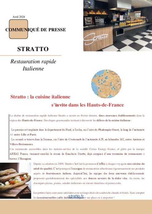 Restauration commerciale 10 avril 2024 - 11:04 La chaîne de restauration rapide italienne Stratto a ouvert en février dernier, deux nouveaux établissements dans la région des Hauts-de-France. Des étapes gourmandes invitant à découvrir les délices de la cuisine italienne . PDF (373 Ko) Télécharger