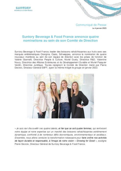 Suntory Beverage & Food France annonce 4 nominations au sein de son Comité de Direction