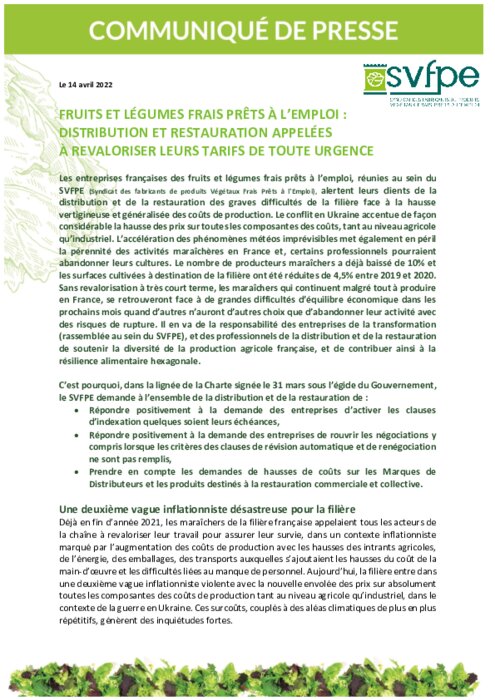 SVFPE (Syndicat des fabricants de produits Végétaux Frais Prêts à l'Emploi), alertent leurs clients de la