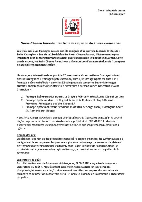 Métiers 07 octobre 2024 - 15:43 Le 4 octobre à Lugano se sont déroulés les Swiss Cheese Awards. Lors de cette édition 2024, trois fromages d’exception ont été couronnés « Swiss Champions », reflétant ainsi toute la diversité et la qualité du patrimoine fromager suisse. PDF (206 Ko) Télécharger